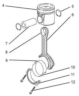 3.如果更換了連桿組件(6),襯套(8)和活塞銷(7),請參閱《技術(shù)規(guī)格》,“連桿”以了解更多信息。
