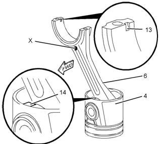 5將活塞(4)頂部朝下放置在適當(dāng)?shù)谋砻嫔稀⑦B桿(6)的鍛造標(biāo)記(X)定位到活塞上的方形凸臺(tái)(14)。確保連桿上的槽(13)正確定位。請參閱圖224。