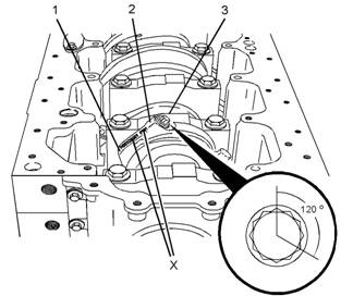 注:確保連桿蓋(2)位置(X)與連桿(1)位置(X)上的蝕刻編號(hào)相互匹配。確保連桿蓋(2)的朝向正確。上下軸瓦的定位凸舌應(yīng)在同一側(cè)。