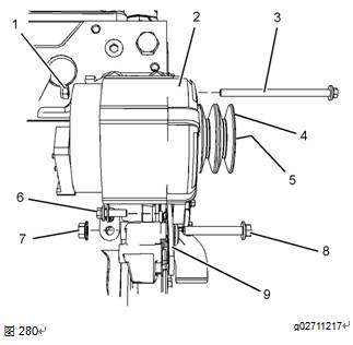 5.安裝支架(9),然后將螺栓和墊片(6)安裝到交流發(fā)電機(2)上,用手擰緊。