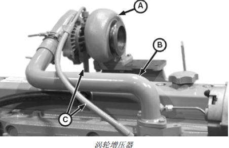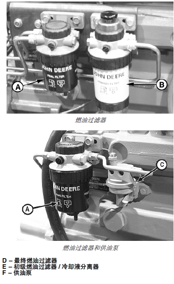 注意: 燃油過濾器(A) 和(B)、輸油泵(C) 的位置隨John Deere約翰迪爾強鹿柴油發(fā)動機和噴油泵型號的不同而有所改變。關于按要求拆卸過濾器和/ 或供油泵的步驟,請參見 CTM217(機械燃油系統(tǒng))、CTM179 (配有 Bosch VP44泵的 4 級電子燃油系統(tǒng))CTM341 (配有Stanadyne DE10 泵的 12 級電子燃油系統(tǒng))或CTM284 (只有英文版)(配有 Delphi/LucasDP201 泵的 1 級電子燃油系統(tǒng))的第 02 部分第090 章。