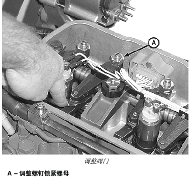 如果需要調整閥門,松開搖臂調節(jié)螺釘上的鎖緊螺母(A)。轉動調整螺釘直到塞尺的滑動略有阻力為止。用螺絲刀固定調整螺釘防止其轉動,同時按技術規(guī)格要求擰緊鎖緊螺母。擰緊鎖緊螺釘后再次檢查間隙。必要時,再次調整間隙。
