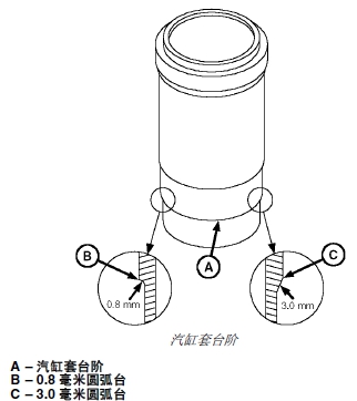 老式汽缸套機加工時有 0.8 毫米的圓弧臺,安裝過程中,可能會使密封圈受到損壞。裝對于這類汽缸套,要用油石或砂布將臺階的銳邊 (B) 倒成 45° 度角。裝新汽缸套采用 3.0 毫米圓弧臺 (C),安裝時不會損壞密封圈。裝