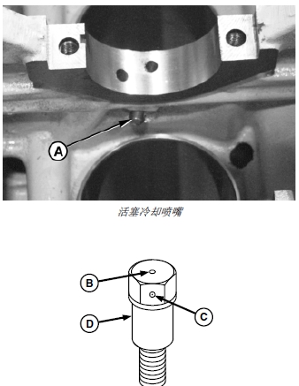 重要提示: 活塞冷卻噴嘴故障會導致活塞、活塞銷、連桿銷襯套和汽缸套損壞。如果活塞冷卻噴嘴失效,會造成油壓降低,甚至無油壓。