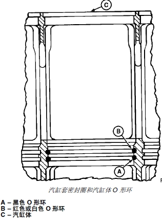 重要提示: 汽缸套密封圈和 O 形環不得使用機油或清洗劑。裝石油制品可使紅色(或白色) O形環膨脹,在汽缸套安裝過程中造成 O 形環損壞。裝