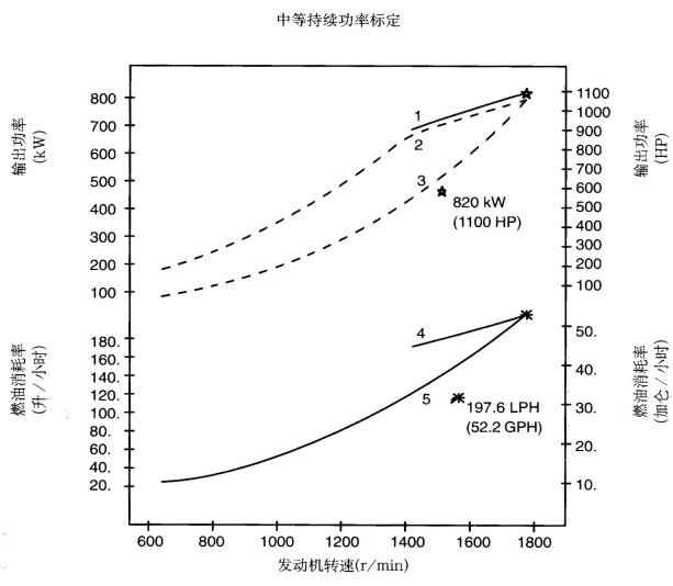 標定條件:功率標定是基于ISO8665標準規定的條件:大氣壓力為100kPa (29.612英寸汞柱),環境溫度為25℃(77°F),相對濕度為30%。螺旋槳軸功率為按97%扣除齒輪箱損失后的凈功率。燃油消耗是基于使用比重為838.9g/l(7.001磅/加侖),LHV為42780kJ/kW(18390Btu/lb)的35°API燃油。 1. 制動功率 kW(HP) 4. 軸功率對應的燃油消耗 2. 扣除齒輪箱損失后的軸功率 kW(HP) 5. 螺旋槳推進曲線對應的燃油消耗 3. 螺旋槳推進曲線 持續功率:這種功率標定的發動機允許在全負荷工況下連續不斷地使用。這種功率為ISO3046標準功率 * 對非LTA發動機,其燃油耗高1-3%。 | |||||||