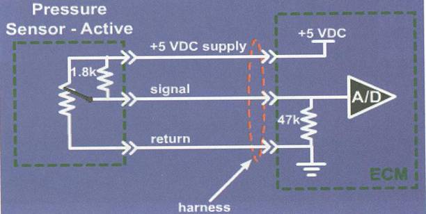 康明斯發動機上使用的壓力傳感器有兩種不同的工作原理,一種是電容式壓力傳感器,另外一種是壓電晶體式。兩種傳感器均為三線式,兩根電源線向傳感器提供5伏的工作電壓,一根信號線向ECU(M)提供壓力信號電壓。