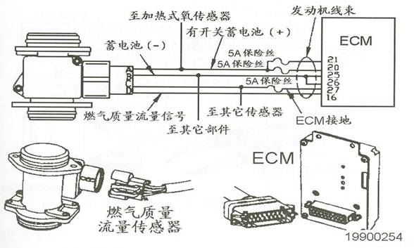 電子控制模塊(ECU(M))通過GMFS來測量從燃料供應管輸送到發動機的燃氣量。GMFS通過蓄電池供電。燃氣質量流量傳感器是一個熱絲風速計,它通過計量將電熱絲維持在恒定溫度所需要的電功率確定燃氣的流量。當有更多的燃氣流經流量傳感器的電熱絲時,電熱絲就需要更大的電功率來維持其保持在恒定的溫度。