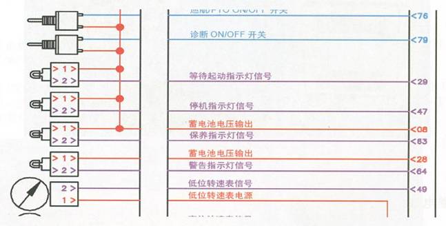電路圖中的顏色:康明斯原裝的電路圖為彩色圖,圖中線路總共有五種顏色,分別是紅色、藍色、黑色、紫色、和綠色。紅色代表系統供電電路的火線,包括電瓶向ECU(M)的供電電路火線和ECU(M)向輸入輸出設備供電電路的火線;藍色代表輸入設備向ECU(M)輸入信號的信號電路,包括各種開關和傳感器及油門的輸出信號線;黑色代表供電電路的地線,包括電瓶回路的地線和ECU(M)向輸入輸出設備供電的地線;紫色代表ECU(M)向輸出設備提供控制信號的控制信號線;綠色為數據通信線路。
