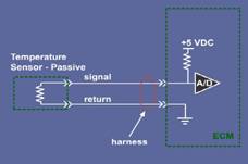 下圖所示為溫度傳感器的工作原理。隨著溫度的升高,熱敏電阻值降低,從而使信號電壓降低。根據溫度傳感器的工作原理,可以用檢查熱敏電阻阻值的方法檢查溫度傳感器。通過對比實際測得的電阻值和參數表中的電阻值,即可判斷溫度傳感器是否在正常工作。