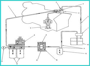 1. 高壓油泵進油管 2. 減振器 3. 回油節流孔 4. 高壓油泵 5. 回油管 6. 噴油嘴 7. 連接塊 8. 手動注油泵 9. 注油旁通閥 10. 燃油箱 11. 進油管 12. 燃油粗濾器(CWR 沒有) 13. 燃油壓力表 14. 燃油細濾器 15. 溢流閥 16. 燃油輸送泵