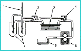1. 去主油道的管路  2. 機油濾清器旁通閥  3. 機油冷卻器  4. 機油冷卻器旁通管  5. 機油泵 6. 油底殼 7. 機油濾清器