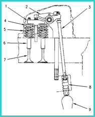 1. 氣門過橋 2. 搖臂 3. 推桿 4. 氣門彈簧旋轉壓盤 5. 氣門彈簧 6. 氣門導管 7. 氣門 8. 氣門挺柱 9. 凸輪軸