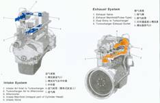 ①系統組成:進氣過渡管、空氣濾清器、增壓器、進氣歧管、排氣歧管、排氣管等。