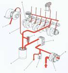 1、機油泵2、限壓閥3、機油散熱器4、濾清器旁通閥5、機油濾清器6、增壓器輸油管7、增壓器回油管8、活塞冷卻噴嘴9、機油泵惰輪
