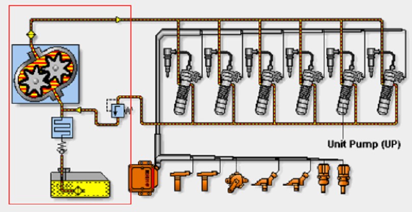 低壓油路組成:油箱、低壓輸油泵、燃油濾清器(粗濾器、細濾器)、相應的油管。