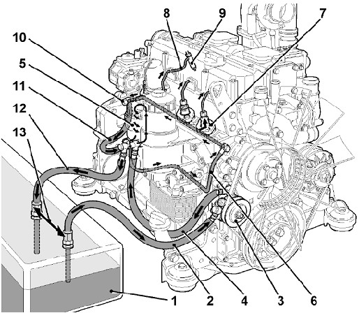 1 - 柴油箱 2 - 燃油進油管 3 – 燃油輸油泵 4 – 濾清器前燃油管 5 – 燃油濾清器 6 –濾清器后燃油管 7 – 單體泵 8 – 高壓油管 9 – 噴油器 10 – 限壓閥 11 – 回油管 12 – 回油管 13 – 燃油箱內進回油管距離規定