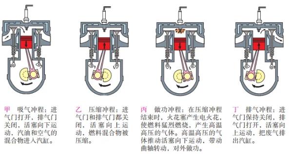 ③兩種發(fā)動(dòng)機(jī)運(yùn)轉(zhuǎn)的第一循環(huán),都必須靠外力使曲軸旋轉(zhuǎn),才能完成進(jìn)氣和壓縮行程;做功行程開(kāi)始后,做功能量?jī)?chǔ)存在飛輪內(nèi),以維持循環(huán)繼續(xù)進(jìn)行。