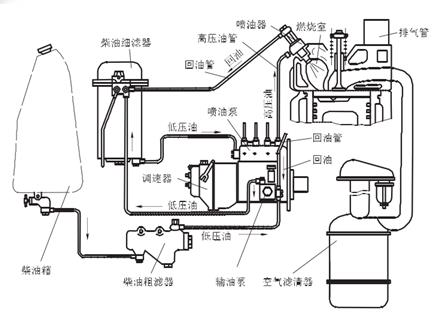 ①燃油供給裝置:由柴油箱、輸油泵、低壓油管、柴油濾清器、噴油泵(包括調速器)、高壓油管、噴油器、回油管組成。