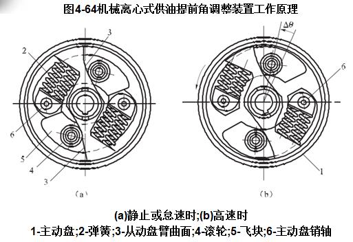 機械離心式供油提前角自動調節裝置位于聯軸器和噴油泵之間,聯軸器的從動部分即調節裝置的驅動部分,調節裝置的從動部分即噴油泵的驅動部分。
