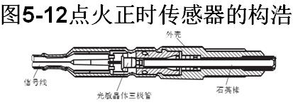 點火正時傳感器,如圖5-12所示。燃燒室內(nèi)的燃燒光通過石英導(dǎo)入光敏晶體三極管,轉(zhuǎn)換成電信號,ECU則根據(jù)此信號判定實際點火的時刻,并以此修正噴油提前角。
