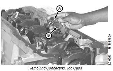 7. Remove rod cap screws and rod caps (A) with bearings (B).