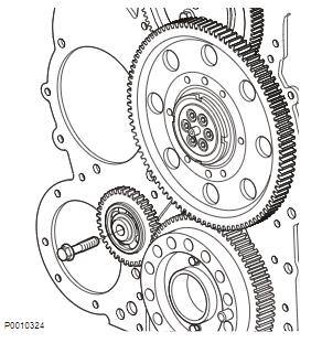 13 如下調整齒輪隙測量值。松開上部沃爾沃發動機中間齒輪的螺栓,使它可以移動。通過來回旋轉曲軸齒輪進行檢查。當順時針旋轉沃爾沃發動機凸輪軸齒輪直到停止時,中間齒輪移到左側,從而獲取凸輪軸齒輪與中間齒輪之間的較大齒輪隙測量值。當逆時針旋轉凸輪軸齒輪直到停止時,沃爾沃發動機中間齒輪移到右側,這樣便無法獲取凸輪軸齒輪與中間齒輪之間的齒輪隙測量值。為了將齒輪隙調整到正確值,在齒輪之間插入一個 0.10 mm(0.0039")的測隙規,順時針轉動凸輪軸齒輪直至其停止。然后擰緊中間齒輪螺栓并拆下測隙規。