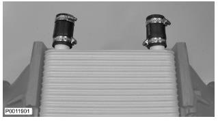 65 僅適用于 D13B-A/C/G/H/K/L,D13C2-A,D13C4-A(雙渦輪增壓器)向上提升增壓空氣冷卻器并將軟管滑到冷卻軟管上。使用所有螺栓固定增壓空氣冷卻器。圖示為帶廢氣門的渦輪增壓器(D13B-A/C/G/H/K/L,D13C2-A,D13C4-A,雙渦輪增壓器)。
