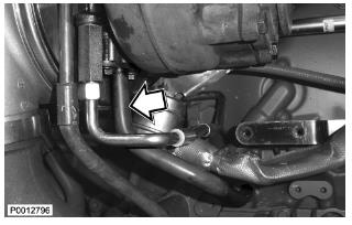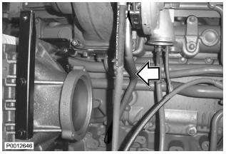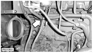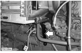 69 僅適用于 D13B-B/D/E/F/J/M/N,D13C1-A,D13C3-A(單渦輪增壓器)將回油管安裝到渦輪增壓器上。安裝冷卻劑管路。重要!管路必須牢牢壓入發(fā)動機機體中。如果新密封件在安裝到管路上之前用 VP 潤滑油(零件號1698135-8)潤滑過,并且在管路被壓到位之前發(fā)動機機體中的孔潤滑過,該步驟將更容易進行。用鎖止夾安裝管路。