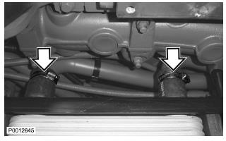 67 僅適用于 D13B-A/C/G/H/K/L,D13C2-A,D13C4-A(雙渦輪增壓器)如圖示將軟管夾緊固到位(以在裝配發(fā)動機時緊固/松開它們)。檢查冷卻劑管和軟管,確保其不與增壓空氣冷卻器后面的任何部分發(fā)生摩擦。