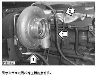 74 僅適用于 D13B-A/C/G/H/K/L,D13C2-A,D13C4-A(雙渦輪增壓器)安裝渦輪增壓器和廢氣門閥輸油軟管。用一個電纜結(jié)將廢氣門閥輸油軟管固定到渦輪增壓器回油管上。