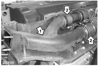 82 僅適用于 D13B-A/C/G/H/K/L,D13C2-A,D13C4-A(雙渦輪增壓器)安裝空氣過濾器固定器(1)。將橡膠螺柱軟管(2)夾緊至渦輪增壓器。安裝 CCV 單元管路并固定夾子。