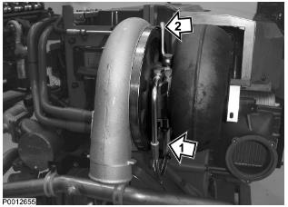 73 安裝渦輪增壓器軸承冷卻水軟管(1)。僅適用于 D13B-A/C/G/H/K/L,D13C2-A,D13C4-A(雙渦輪增壓器)將來自廢氣門閥的油管(2)安裝到油底殼并連接電氣端子。將油管夾緊固定到油冷卻器蓋上