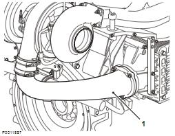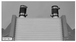 9 將增壓空氣冷卻器安裝到下部螺柱上。將螺柱連接導入增壓空氣管并導入冷卻水軟管。注意 確保軟管上有軟管夾。將增壓空氣冷卻器按壓到位;安裝上部螺栓并將螺母擰至螺柱上。緊固螺母。