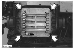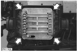 6 拆下增壓空氣冷卻器的上部螺栓。拆下增壓空氣冷卻器固定螺母。沿直線拉出增壓空氣冷卻器。確保軟管從增壓空氣冷卻器上脫離。