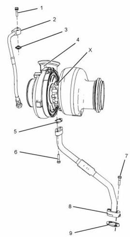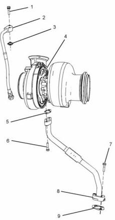 b. 將新接頭(5)放置在渦輪增壓器(4)和管組件(8)之間。安裝螺栓(6)擰緊。