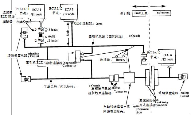 物理層(工作草案為ISO 11783 中的第2部分,1997年5月)。在250Kb/秒的速度下工作,線性總線帶有四芯絞線。 |