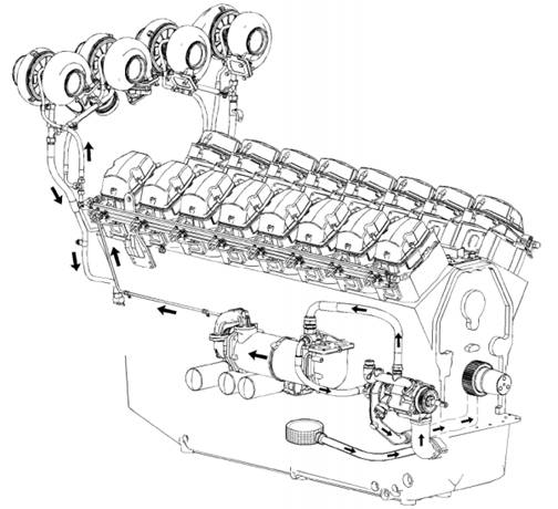 Perkins4016柴油發動機機油通過A排由齒輪驅動的機油泵輸送,流過網狀粗濾器。機油泵將機油送至可調節安全閥。安全閥允許過多的機油通過發動機曲軸箱的門流回發動機油底殼,以保持正確的工作壓力。輸送的機油通過機油管在A排和B排之間分流。機油管穿過發動機油底殼的內部。接著,部分機油流過每排的單個機油濾清器。此后機油流向發動機曲軸箱內用于、A卻活塞的油道。