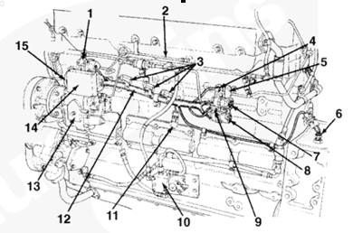 1油軌壓力傳感器,2燃油連接塊,3燃料切斷閥4發動機線束,5 C6 接頭,6 C5 接頭,7 OEM C5 和 C6 接頭支架,8發動機轉速傳感器,9系統接地接頭,10液壓機械式 STC 執行器,11發動機側數據通信接頭,12保險絲 (5A),13 ECM,14燃油泵,15電子燃油控制閥。