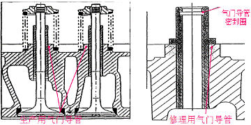 3、新機的氣門導管沒有定位肩。但修理時為了準確定位,氣門導管是帶定位肩的(原裝發動機)。氣門導管密封圈鑲嵌在導管內。