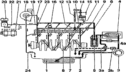 1.油底殼 2.進氣歧管 3.機油泵 3a回油閥 3b泄壓閥 4.機油散熱器 4b.機油散熱器旁通閥 5.機油濾清器 6.主油道 7.主軸承 8.連桿軸承 9.凸輪軸軸承 10.通噴油孔的油路 11.冷卻活塞的噴油孔 12.搖臂脈沖滑的挺柱控制孔 13.推桿 14.搖臂 15通油底殼的回油道 16.機油傳感器 17.通廢氣渦輪增壓器的油路 18.廢氣渦輪增壓器 19.通壓縮機或液壓泵的油路 20.壓縮機 21.液壓泵 22.壓縮機或液壓泵的回油路 23.回油底殼 24.從增壓器回曲軸箱