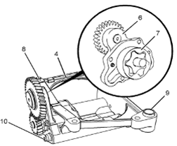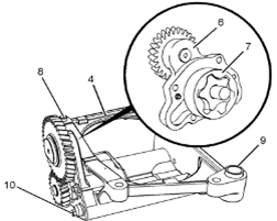 4如有必要,從Perkins1106A/C發動機機油泵的前蓋組件(6)上卸下螺栓(10)。從Perkins1106A/C發動機機油泵(4)上卸下前蓋組件(6)。