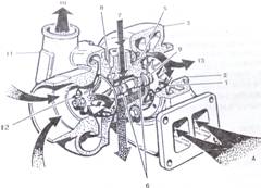 • 機器的排氣經4進入,膨脹驅動渦輪機,給壓縮機提供動力,經13排入大氣。燃燒的空氣經過濾器從12進入壓縮機,經10送至散熱器冷卻后送入機器。