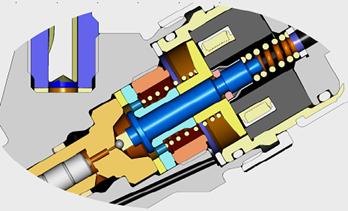 當噴油器的電磁閥被觸發,泄油孔被打開,這引起控制腔的壓力下降,結果,活塞上的液壓力也隨之下降,一旦液壓力降至低于作用于噴油嘴針閥承壓面上的力,針閥被打開,燃油經噴孔噴入燃燒室。這種對噴油嘴針閥的不直接控制采用了一套液壓力放大系統,因為快速打開針閥所需的力不能直接由電磁閥產生,所謂的打開針閥所需的控制作用,是通過電磁閥打開泄油孔使得控制腔壓力降低,從而打開針閥。
